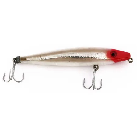 Tämä tarkalleen 1/2 unssia (14 g) painava, Yhdysvalloissa valmistettu pintaviehe on klassinen esimerkki L&S Bait Mirro lure -käsityötaidosta. MirrOlure Top Dog, tuotekoodiltaan 10219, on pituudeltaan 4 1/4" (10,5 cm) ja se on kelluva malli, joka on suunniteltu erityisesti pintakalvokalastukseen. Tässä yksilössä on silmiinpistävä punainen pää, joka vaihtuu helmiäishopeaksi rungoksi. Tämä on erittäin näkyvä väriyhdistelmä, jota suosivat erityisesti hauen ja suurten ahventen kalastajat. Varustukseen kuuluu kaksi vankkaa kolmihaarakoukkua – yksi vatsassa ja yksi pyrstössä – jotka on kiinnitetty kestävillä metallilenkeillä. Punaisessa pääosassa on yksinkertainen musta silmä, joka toimii selvänä kiintopisteenä. Tämä kyseinen viehe on erinomaisessa kunnossa, ja sen erittäin hyvin säilynyt viimeistely oikeuttaa 5/5 kuntoluokitukseen. Pyrstökoukun kiinnikkeessä on levenevä metallikaulus, joka on erityinen yksityiskohta tämän kelluvan walker-vieheen kokoonpanossa.
