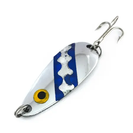 Takapuolelle on selkeästi leimattu "Moriyama JAPAN" -merkintä, joka kertoo tämän 1/4oz (7g) lusikan korkeasta laadusta. Vieheen etupuolella on korkeakiiltoinen nikkeli-viimeistely, jonka katkaisee kirkkaan sininen pystyraita, jossa on ainutlaatuinen aaltoileva hopeinen kuviointi. Lähellä etureunaa on silmiinpistävä keltainen silmä mustalla pupillilla, mikä tuo visuaalista syvyyttä 1 1/2" (4cm) runkoon. Tässä kappaleessa, tuotekoodiltaan 8088, on alkuperäiset varusteet, mukaan lukien puhdas kolmihaarakoukku ja uistinrenkaat. Kuntoarviolla 5/5 heijastavat pinnat ja maalatut yksityiskohdat ovat säilyneet poikkeuksellisen hyvin, mikä osoittaa vintage-japanilaisen valmistusprosessin kestävyyden. Paksu metalli ja pisaramainen muoto tekevät siitä luotettavan valinnan pitkiin heittoihin tai tasaiseen uisteluun.