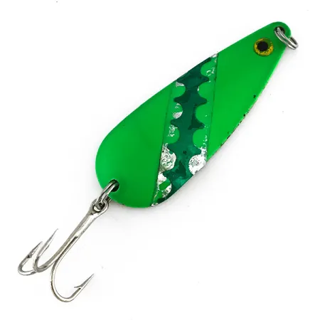 Raskas metallirakenne ja kirkkaanvihreä viimeistely määrittelevät tämän 25 gramman (1 oz) lusikkauistimen, joka on suunniteltu pitkiin heittoihin tai uisteluun voimakkaassa virrassa. Sen 7 cm (2 3/4") rungon poikki kulkee diagonaalinen nikkeliraita, jossa on selkeä sahalaitakuvio, joka tarjoaa jyrkän kontrastin tasaiselle vihreälle maalille. Pieni, keltamustaksi maalattu silmä lähellä kärkeä tuo perinteisen ilmeen kokonaisuuteen. Japanissa stansatussa vieheessä on kiillotettu nikkelitausta, jossa on hieman kevyttä pintakulumaa ja vähäistä hapettumista, mikä vastaa 3/5-kuntoluokitusta. Varusteet ovat pysyneet vankkoina, sisältäen alkuperäiset uistinrenkaat ja tukevan kolmihaarakoukun, joka on kiinnitetty leveämpään peräpäähän. Tuotekoodilla 8263 tunnistettava Moriyama-yksilö heijastaa 1900-luvun puolivälin japanilaiselle viennille tyypillistä käytännönläheistä valmistustyyliä. Lusikan paksuus ja painonjakauma mahdollistavat syvyyden säilyttämisen tehokkaasti tasaisessa kelauksessa.