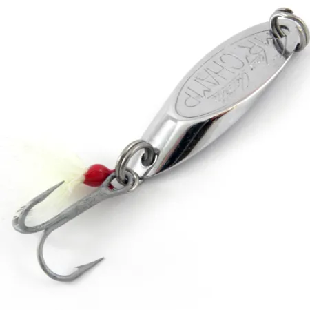 Kiillotettuun kromipinnoitteeseen syvälle stanssatut "MR CHAMP" ja "Tony Accetta" -tekstit osoittavat tämän 8 gramman (1/4oz) lusikkauistimen olevan aito amerikkalainen laatutuote. Pituudeltaan 4 cm (1 1/2") oleva tuotekoodi 3846 edustaa mallin höyhenellä varustettua versiota, jossa on valkoinen höyhenperho peräkoukussa. Pieni, kirkkaanpunainen pää päättää höyhensidoksen ja luo kontrastin rungon hopeiseen välkkeeseen. Tämä yksilö on erinomaisessa kunnossa (arvosana 5/5) ja näyttää käyttämättömältä; raskaissa uistirenkaissa tai korkeakiiltoisessa pinnassa ei ole kulumisen merkkejä. Täysmetallinen runko on kärkeä kohti kapeneva heitto-ominaisuuksien parantamiseksi, ja kääntöpuolella on selvästi näkyvä tunnistetarra. Höyhenpyrstö on sidottu tiukasti, ja alkuperäinen kolmihaarakoukku on terävä ja rakenteellisesti moitteeton.