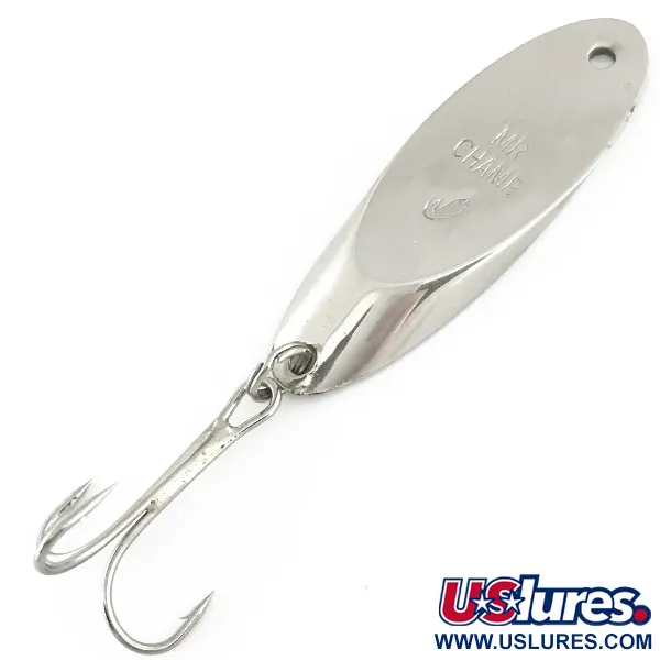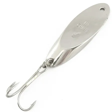 Nikkelöinti antaa klassisen, heijastavan pinnan tälle 21g (3/4oz) painavalle metallivieheelle. Valmistaja on Weber, amerikkalainen valmistaja, jolla on vuosisadan mittainen perintö kalastustarvikealalla. Mr Champ -malli siirtyi myöhemmin Luhr Jensenin omistukseen. Rungon pituus on 6cm (2 1/4") ja siinä on suoraan metalliin stanssattu nimi "MR CHAMP". Tämä yksilö, tuotekoodiltaan 6932, on huippukunnossa (arvosana 5/5). Siiman kiinnitystä varten kapeassa päässä on siisti reikä, ja perässä on uistinrenkaalla varmistettu kolmihaarakoukku.