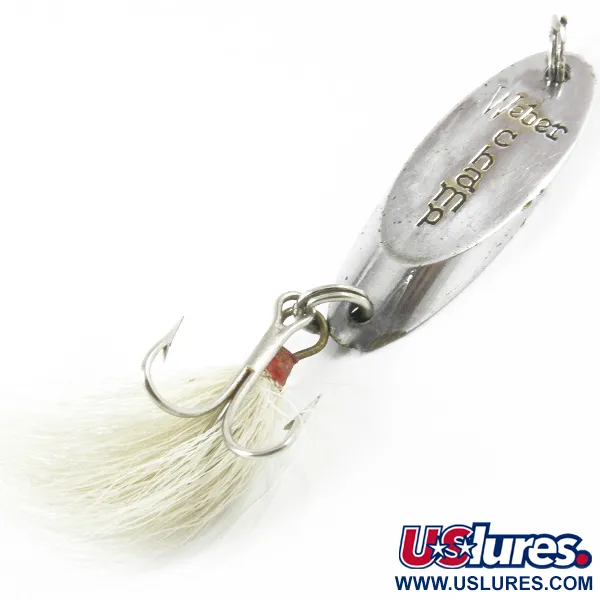 Nikkelöityyn pintaan on selkeästi meistetty Weber MrChamp -brändi, mikä osoittaa tämän 4 cm (1 1/2") lusikan olevan klassinen esimerkki vuosisadan puolivälin kalastusvälineistä. Tämä Yhdysvalloissa tuotekoodilla 3430 valmistettu viehe on viimeistelty kiillotetulla nikkelillä, joka heijastaa valoa tehokkaasti pisaranmuotoisesta rungostaan. Pyrstöosa on varustettu höyhenperho-kolmihaarakoukulla, joka on sidottu ammattitaitoisesti valkoisesta bucktail-karvasta ja viimeistelty varren punaisella sidoslangalla. 8g (1/4oz) painoinen viehe kuvastaa niitä korkeita valmistusstandardeja, joita Weber ylläpiti ennen kuin merkki siirtyi Luhr Jensenille. Tämä yksilö on 4/5-kunnossa; pinta on hyvin säilynyt ja alkuperäinen loisto tallella. Keulassa oleva uistinrengas ja koukun kiinnitys ovat molemmat tukevia, korostaen MrChamp-sarjalle ominaista yksinkertaista mutta tehokasta muotoilua.
