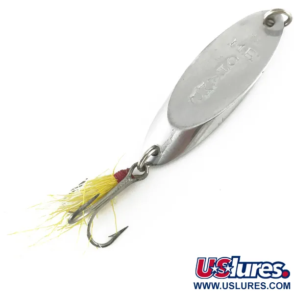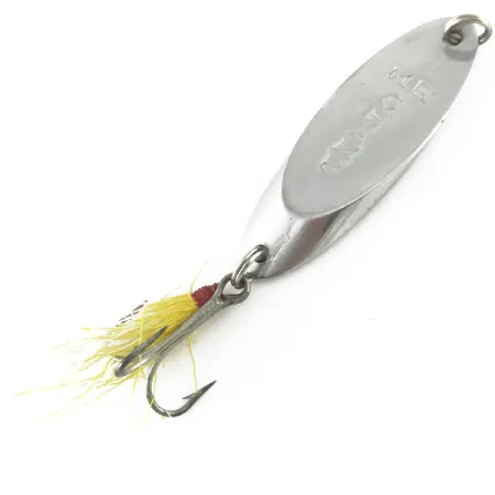 Kiillotettuun hopearunkoon syvälle stanssattu MrChamp-nimi tunnistaa Weberin valmistaman amerikkalaisen kalastushistorian klassikon (tuotekoodi 6695). Tämä 1/2 unssia (14 g) painava lusikkauistin on varustettu höyhenkolmikoukulla, jossa on kirkkaankeltaisia kuituja ja punainen lankakaulus. Pituudeltaan 2" (5 cm) uistimen heijastava pinta on 5/5-kunnossa ja näyttää täysin käyttämättömältä alkuperäisen peilimäisen viimeistelynsä ansiosta. Ennen kuin Luhr Jensen lopulta osti MrChamp-tuotemerkin, Weber toimi yli vuosisadan merkittävänä valmistajana Yhdysvalloissa ja Kanadassa. Kompakti, painava muotoilu on tarkoitettu pitkiin heittoihin ja syvyyksiin, joissa hopeinen välähdys säilyy näkyvissä. Tukevat uistinrenkaat yhdistävät varusteet molemmissa päissä, mikä heijastaa tälle amerikkalaisvalmisteiselle yksilölle tyypillistä kestävää laatua.