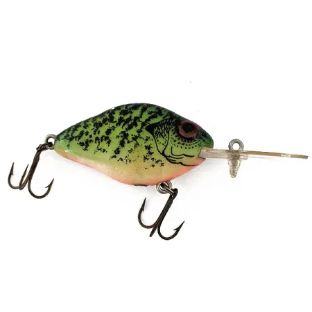 Tämä 5 cm (2") pituinen uistin edustaa Lazy Ike -merkin kehitystä vuosisadan puolivälissä, jolloin käsintehdystä puusta siirryttiin kestävään muoviin. Tässä 8 g (1/4 oz) painoisessa vaapussa on yksityiskohtainen crappie-kuviointi, jossa on kirkkaanvihreä pohjaväri, voimakas musta laikutus ja vaalea, kermanvärinen vatsa. Sen suuri, tumma silmä on Natural Ike -sarjan tunnusomainen piirre, jonka tarkoituksena on jäljitellä aidon pikkukalan anatomiaa. Alun perin Kautzky Manufacturing Companyn valmistama — vuonna 1897 itävaltalaisen maahanmuuttajan perustama yritys, josta tuli myöhemmin osa Pradco-konsernia — tämä malli kantaa tuotekoodia 14779. Kirkkaaseen muoviseen uintilevyyn on painettu mallin nimi, ja vaikka siinä on pieni halkeama, uistin on säilynyt merkittävänä osana amerikkalaista kalastushistoriaa. Kaksi tavallista kolmihaarakoukkua on kiinnitetty vatsa- ja pyrstölenkkeihin. Tämän yksilön kuntoluokitus on 4/5, ja sen maalipinta on säilynyt hyvin huolimatta uintilevyn vähäisistä rasitusjäljistä.