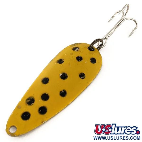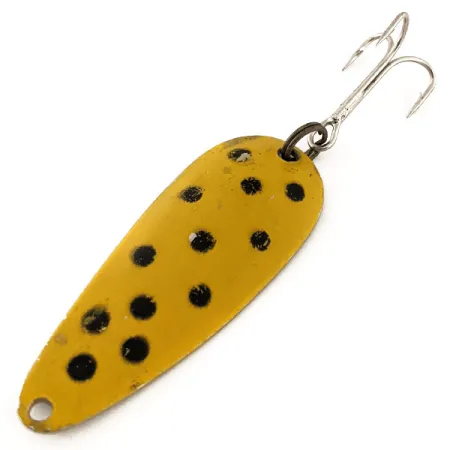 Keltainen maali suurilla, käsin lyödyillä mustilla pisteillä peittää tämän 5,5 cm metallisen lusikan kuperan puolen. Nebco FlashBait 266 painaa 10 g, ja sen kääntöpuoli on kiillotettua nikkeliä, johon on meistetty "FLASH BAIT NEBCO" -brändäys ja valmistusmaa USA. Uistin on varustettu tummalla uistinrenkaalla ja terävällä kolmihaarakoukulla. Tuotekoodilla 11765 luetteloitu vintage-yksilö on kuntoluokitukseltaan 4/5; siinä on vähäistä varastoinnista johtuvaa kulumista, mutta maali ja meistokset ovat säilyneet selkeinä.
