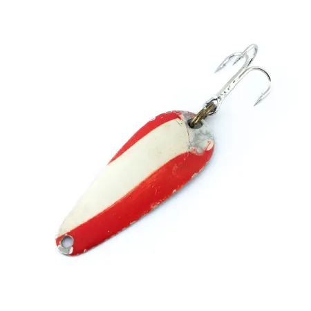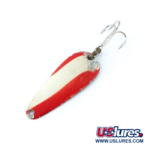 Punaiset ja valkoiset vinoraidat nikkelöidyssä kyyneleenmuotoisessa rungossa määrittävät tämän vintage Nebco FlashBait 366 -uistimen visuaalisen ilmeen. Vain 1,9 g (1/16 oz) painoisena ja 3,3 cm (1 1/4") pituisena se edustaa vuosisadan puolivälin amerikkalaisen kalastushistorian hienovaraisempaa puolta. Lusikkauistimen kääntäminen paljastaa metalliin puristetun aidon Nebco-valmistajan leiman, joka vahvistaa sen alkuperäksi Yhdysvallat. Tämän tuotekoodilla 11092 luetteloidun kohteen kuntoluokitus on 4/5, ja sen viimeistely on säilynyt hyvin ja kiiltävänä. Varustukseen kuuluu perinteinen uistinrengas ja terävä kolmihaarakoukku, jotka säilyttävät vieheen alkuperäisen profiilin. Maalipinnassa on aikakaudelle tyypillinen kerroksellinen rakenne, joka erottuu kiillotetusta nikkelitaustasta.