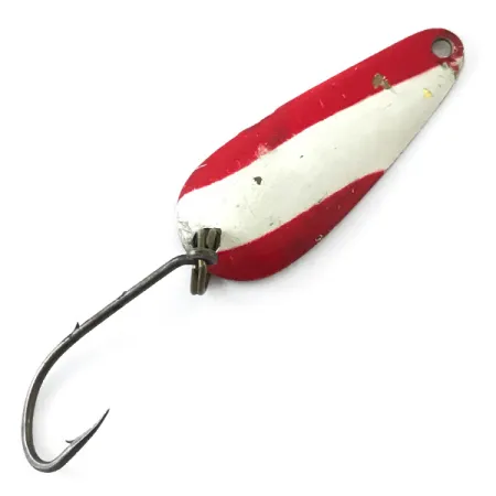 Tämä vain 1/16 oz (1,9 g) painava vintage-lusikka korostaa varhaista amerikkalaista keskittymistä ultrakevyeen finesse-kalastukseen. Nebco FlashBait 366, tuotekoodiltaan 5511, on pituudeltaan 1 1/4" (3,3 cm) ja sen etupuolella on erittäin kontrastinen puna-valkoraitainen maalaus. Kääntöpuolen kultapintaiseen viimeistelyyn on leimattu tuotemerkki ja mallinumero, mikä osoittaa sen olevan yhdysvaltalaista käsialaa. Tämä yksilö on 4/5-kunnossa, siinä on alkuperäinen pronssattu yksittäiskoukku ja vain vähäisiä pintajälkiä historiastaan vieherasiassa. Pisaran muoto ja kiillotettu kultainen tausta on suunniteltu erityisesti ahvenkalojen ja taimenen pyyntiin kirkkaissa vesissä. Metallirungon yläosassa on pieni kiinnitysreikä siiman suoraa sidontaa tai pientä lukkoleikaria varten.