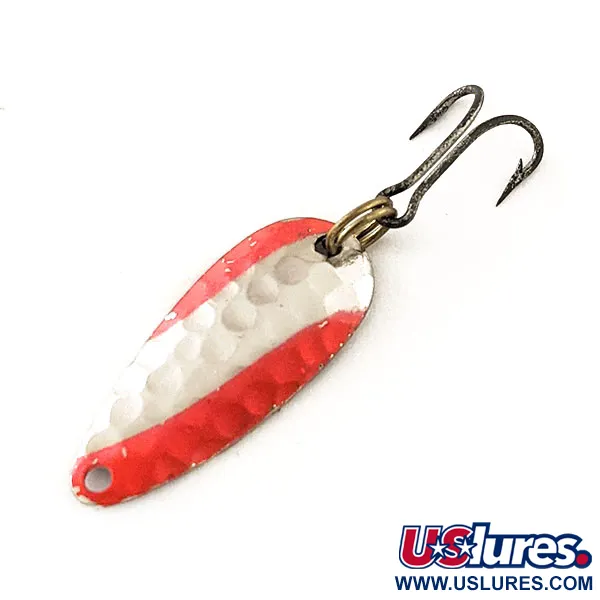 Vasaroitu nikkelipinta kerää valoa tässä pienessä 1/32 unssin (1 g) Nebcon vintage-malliston uistimessa. Vain 0 3/4 tuuman (2,2 cm) mittaisessa FlashBait 466 UV -mallissa (tuotekoodi 12115) on silmäänpistävä punahopeinen vinoraitakuviointi kuoppaisella pinnalla. Vaikka se näyttää normaalissa valossa perinteiseltä puna-nikkeliseltä lusikalta, punainen pigmentti on suunniteltu reagoimaan ultraviolettivaloon näkyvyyden parantamiseksi tietyissä vesiolosuhteissa. Tämä Yhdysvalloissa valmistettu viehe on varustettu yhdellä kolmihaaralla ja on säilynyt erittäin siistissä kunnossa (arvosana 5/5). Metallirungon kapeassa päässä on tarkasti porattu reikä kiinnitystä varten, ja leveämpi peräosa luo pohjan heijastavalle vasarointiefektille.
