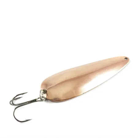 Kupari toimii tämän klassisen lusikkauistimen pohjana tarjoten lämpimän metallisen hohdon, joka on vanhentunut arvokkaasti. Arvosanalla 4/5 arvioitu pinta on säilynyt kirkkaana, ja metallissa on vain vähäisiä merkkejä sen kalastushistoriasta. Koveraan sisäpintaan on selvästi leimattu tunnistetiedot "NEBCO" FLASH-BAIT 66, mikä osoittaa sen olevan peräisin MPLS., MINN. USA:sta. Tämä yksilö, tuotekoodiltaan 2823, on pituudeltaan 3 1/2" (9 cm) ja painoltaan 3/4oz (21 g). Varustukseen kuuluu tukeva kolmihaarakoukku, joka on kiinnitetty metallisella uistinrenkaalla leveään päähän, kun taas kapeassa päässä oleva reikä toimii kiinnityspisteenä lukolle tai perukkeelle. Sen pitkänomainen pisaraprofiili on suunniteltu perinteiseen heitto- tai vetouisteluun makeassa vedessä.
