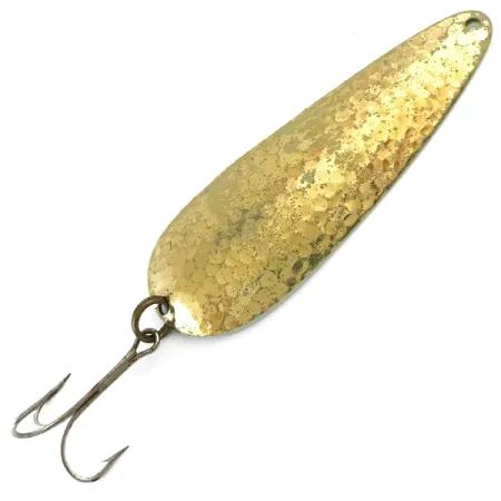 Vasaroitu messinki antaa tämän lusikan 9 cm (3 1/2") rungolle erottuvan, kuoppaisen pintarakenteen, joka heijastaa valoa eri suuntiin. Tässä Yhdysvalloissa valmistetussa Nebco-yksilössä, tuotekoodi 5341, on huomattava 21 g (3/4 oz) paino, mikä tekee siitä erinomaisen syvempien kohtien tavoittamiseen tai pitkien heittopituuksien saavuttamiseen. Vieheen kääntöpuolelle on selkeästi leimattu valmistajan nimi ja FlashBait 66 -mallimerkintä, mikä on merkille tyypillistä tuotantoa USA:ssa. Kun otetaan huomioon 4/5 kunto, metallissa on joitakin kevyitä pintajälkiä ja pieniä hapettumispisteitä, jotka ovat tyypillisiä tämän ikäluokan vieheille, mutta alkuperäinen messingin hohde on säilynyt vahvana. Varustus on suoraviivainen: yksi uistinrengas pitää paikallaan tummunutta kolmihaarakoukkua, jonka kärjissä on vain vähän kulumista.