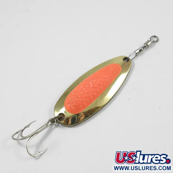 Tämä 1/2 unssin (14 g) painoinen lusikkauistin on suunniteltu pitkiin heittoihin jopa rannikkotuulessa. Kultaviimeisteltyä, paksusta messingistä valmistettua runkoa koristaa kirkkaan oranssi, lohimunaa jäljittelevä ja nystyräpintainen insertti, joka on suunniteltu laukaisemaan lohen ja kirjolohen iskut. Alapuolelle on selkeästi stanssattu "Nebco Pixee Pat. No. 40 1/2 oz USA", mikä osoittaa sen alkuperän ja mallin tuotekoodilla 1949. Pituudeltaan 5,5 cm (2 1/4") uistin on varustettu alkuperäisillä osilla, kuten vahvalla kolmihaaralla ja yläosaan asennetulla leikarilla siiman kiertymisen estämiseksi. Tämän yksilön kuntoarvio on 4/5, ja sen hyvin säilynyt pinta heijastaa valoa erinomaisesti. Rakenne mahdollistaa keinuvan ja pyörivän liikkeen jokien syvissä kuopissa tai tasaisen vaappuvan uinnin järvikelauksessa. Tätä monikäyttöistä viehettä käytetään usein tavoittamaan petokaloja, kuten haukea, jättihaukea ja ahventa eri syvyyksistä.