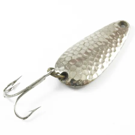 Tässä 4 cm (1 1/2") lusikassa on syvään vasaroitu nikkelipinta, joka on suunniteltu maksimoimaan valon heijastuspinta-ala. Taustapuoli on sileä ja siinä on selkeä 'NEBCO TOR-P-DO 1 MPLS. MINN.' -leima, joka kertoo sen historiasta Minneapolisin kalastusvälinevalmistuksessa. Tämä tuotekoodilla 3277 luetteloitu yksilö painaa 7 g (1/4 oz), mikä tekee siitä vankan valinnan jalokalojen tai ahvenen heittokalastukseen. Varustukseen kuuluu perinteinen kolmihaarakoukku ja uistinrengas, jotka ovat molemmat hyvässä kunnossa. Kuntoluokitukseltaan 4/5 oleva nikkelipinnoite säilyttää korkealaatuisen kiillon molemmin puolin, ja siinä on vain lieviä merkkejä iästä. Siiman kiinnityspiste on siististi porattu kapeaan päähän, ja se on valmis suoraan solmuun tai pieneen lukkoon.