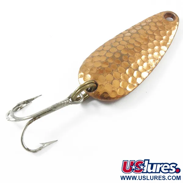 Vasaroitu kuparipinta määrittää tämän vintage-lusikan etupuolen, joka on suunniteltu maksimoimaan valonheijastus eri kulmista. Nebco Tor-P-Do 1 painaa 7 g (1/4 oz) ja on pituudeltaan 4 cm (1 1/2"). Siinä on klassinen pisaraprofiili, joka oli tyypillinen osa Yhdysvaltojen kalastusvälinevalmistusta vuosisadan puolivälissä. Vieheen kääntöpuolella on sileä kuparipinta, johon on selvästi leimattu ”NEBCO”, ”TOR-P-DO-1” ja valmistuspaikka ”MPLS. MINN.”, mikä osoittaa sen olevan peräisin Minneapolisissa toimineelta valmistajalta. Varusteluun kuuluu kestävä uistinrengas ja puhdas kolmihaarakoukku. Vieheessä on vähäisiä ikääntymisen merkkejä, mikä oikeuttaa kuntoluokitukseen 4/5. Tuotekoodilla 3296 listatun uistimen kiinnityssilmukka on täydellisen pyöreä ja vailla rakenteellista kulumista, mikä tekee siitä vankan edustajan yhdysvaltalaiselle heittokalastusvälineistölle.