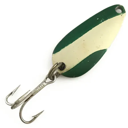 Vihreä ja valkoinen maali on levitetty erottuvalla diagonaalisella raitakuviolla tämän vintage-metallilusikan etupuolelle. Kiillotetun nikkelitaustan kääntöpuolelle on stanssattu klassinen "NEBCO TOR-P-DO-1 MPLS, MINN" -merkintä, mikä osoittaa sen alkuperän Minneapolisissa, USA:ssa. Painoltaan 1/4oz (7g) ja pituudeltaan 1 1/2" (4cm), tämä yksilö kantaa tuotekoodia 5784. Rakenne on klassinen pisaramainen profiili, joka soveltuu useisiin heitto- ja uistelutekniikoihin. Varusteet ovat edelleen tukevat, koostuen alkuperäisestä uistinrenkaasta ja terävästä kolmihaarakoukusta. Kuntoarvio on 5/5; maalipinta on säilynyt kirkkaana ja nikkelipuoli on kiiltävä ja heijastava.
