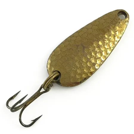 Vasaroitu pronssipinta määrittelee tämän 4 cm (1 1/2") metallilusikan etupuolen, heijastaen amerikkalaisten kalastajien arvostamaa klassista välkettä. Painoltaan 7-grammainen (1/4 oz) yksilö kantaa tuotekoodia 5813 ja edustaa Nicholsin (NY) tehtaan ammattitaitoa. Kääntöpuolen messinkipintaan on stanssattu merkintä "NEBCO TOR-P-DO 1", mikä takaa alkuperän helpon tunnistamisen. Varustukseen kuuluu vankka kolmihaarakoukku, joka on kiinnitetty messinkisellä uistinrenkaalla; molemmissa on vieheen runkoon sopivaa tasaista ikääntymistä. Kuntoluokitukseltaan 4/5 oleva uistin on metallipinnoiltaan hieman tummunut ja siinä on säilytyksestä tulleita pieniä jälkiä, mutta vasaroidut kuviot ovat säilyneet terävinä ja selkeinä. Pisaramainen profiili ja hieman kovera muoto on suunniteltu erityisesti heittokalastukseen tai kevyeen uisteluun.