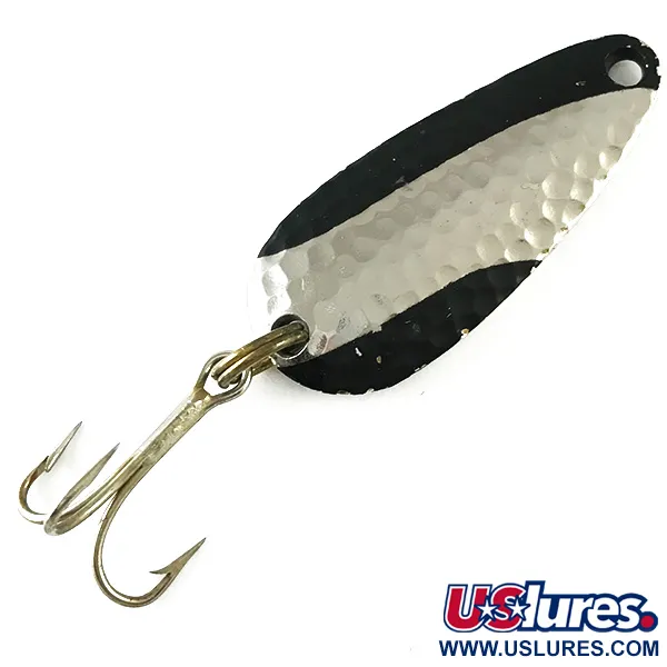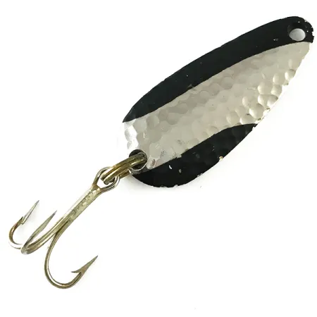Vasaroitu nikkelipinta yhdistettynä voimakkaisiin mustiin yksityiskohtiin antaa tälle vintage-lusikkauistimelle näyttävän ulkoasun. Tämä 1 1/2" (4 cm) pituinen ja 1/4 oz (7 g) painoinen uistin kantaa selkeää "NEBCO" TOR-P-DO-1 -leimaa sekä tietoa alkuperästään Ripley, Miss. -paikkakunnalla kiillotetulla kääntöpuolellaan. Etupuolella on vasaroitu viimeistely, joka on suunniteltu keräämään ja heijastamaan valoa, ja jota kehystää syvänmusta maali kärjissä. Tuotekoodilla 6235 tunnistettava uistin on varustettu perinteisellä kolmihaarakoukulla, joka on kiinnitetty tukevalla uistinrenkaalla. Umpimetallinen rakenne on tyypillistä Yhdysvaltain keskihankkeen valmistusta. Kunto on erinomainen, viimeistely on säilynyt hyvin ja leimat ovat teräviä, ansaiten arvosanan 5/5. Siiman kiinnitysreikä on siisti ja tarkasti porattu pisaranmuotoisen rungon kapeaan päähän.