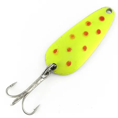 Fluoresoiva keltainen maali peittää tämän 5 cm (2") lusikkauistimen etuosan, tarjoten erinomaisen näkyvyyden syvissä tai värjäytyneissä vesissä. Tuotekoodilla 7109 tunnistettavassa Nebco Tor-P-Do 2 UV -mallissa on punaisia pisteitä etupuolella, mikä luo voimakkaan kontrastin nikkelipohjaa vasten. Tämä amerikkalaisvalmisteinen uistin on rakennettu kiillotetulle nikkelöidylle aihiolle, jonka kääntöpuolelle on selkeästi meistetty "NEBCO TOR-P-DO 2" -merkintä. Painoltaan 14 g (1/2 oz) lusikka soveltuu erinomaisesti pitkiin heittoihin ja hallittuun upottamiseen eri vesikerroksissa. Sen fluoresoiva pinnoite on suunniteltu erityisesti UV-reaktiiviseksi, tarkoituksena hehkua ultraviolettivalossa ja herättää huomiota hämärissä olosuhteissa. Tukeva uistinrengas yhdistää metallirungon terävään kolmihaarakoukkuun takapäässä. Kuntoluokituksella 4/5 varustettu yksilö on hienossa kunnossa, ja pinnassa on vain vähäisiä käsittelyn jälkiä.