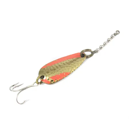 Viistot punaiset raidat kulkevat tämän 4 cm (1 1/2") lusikkauistimen vasaroidun kultapinnan poikki luoden selvän visuaalisen kontrastin. Tämä 7 g (1/4 oz) painava viehe on varustettu etupuolen syvällä vasaroidulla tekstuurilla valon heijastuksen maksimoimiseksi. Uistimen kääntäminen paljastaa sileän, kiillotetun kultaisen taustapuolen, johon on selvästi leimattu valmistajan merkinnät: "Nebco", "TOR-P-DO-1" ja "MADE IN USA". Varusteet ovat ehjät, koostuen uistinrenkaasta ja kuulaketjuleikarista, joka on suunniteltu estämään siiman kiertyminen heitossa tai uistelussa. Kuntoluokituksella 4/5 vieheessä on vähäisiä käytön jälkiä, mutta se on rakenteellisesti ehjä ja pinnoite on säilynyt kirkkaana. Terävä kolmihaarakoukku on kiinnitetty perään uistinrenkaalla, täydentäen tämän klassisen amerikkalaisvalmisteisen tuotteen koodilla 2082.