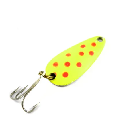 Tämä kompakti lusikkauistin painaa 9 g (1/3 oz), ja siinä on kirkkaankeltainen etupuoli, jossa on selkeät oranssinpunaiset täplät. Kääntöpuolella on kiillotettu nikkeliviimeistely, johon on lyöty syvälle tekstit "NEBCO" ja "TOR-P-DO", mikä osoittaa sen amerikkalaista valmistusperintöä. 4 cm (1 1/2") pituinen metallirunko on varustettu kestävällä messinkisellä uistinrenkaalla ja hopeanvärisellä kolmihaarakoukulla. Etupuolen maalipinta on erittäin tarkka, ja nikkelitausta on säilyttänyt korkean kiillon, mikä tukee tämän 2751-mallin kuntoluokitusta 4/5. Kalastajat käyttävät tätä pisaranmuotoista profiilia yleensä heitto- tai uistelukalastuksessa. Koveralla puolella oleva leimattu teksti on edelleen terävä ja luettava, mikä on avainyksityiskohta vintage Nebco -välineiden keräilijöille.