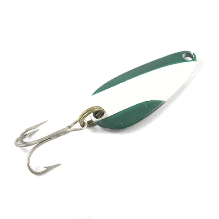 Silmiinpistävät vihreät ja valkoiset vinoraidat koristavat tätä klassista amerikkalaista heittolusikkaa. Nebco Tor-P-Do on pituudeltaan 1 1/2 tuumaa (4 cm), ja sen kompakti profiili yhdistettynä 1/3 unssin (9 g) painoon mahdollistaa tehokkaat ja pitkät heitot. Vieheen kääntöpuolella on kirkas nikkeliviimeistely, johon on siististi stanssattu valmistajan merkintä "NEBCO TOR-P-DO PEQUOT, MINN.", mikä todistaa sen minnesotalaisesta alkuperästä. Tässä nimenomaisessa yksilössä, tuotekoodiltaan 2773, on alkuperäiset varusteet, mukaan lukien tukeva messinginsävyinen uistinrengas ja terävä kolmihaarakoukku. Kuntoarvio on korkea 4/5, pinta on puhdas ja maalattujen osien emalointi kirkas. Pisaranmuotoinen runko on suunniteltu monipuoliseen kalastukseen eri syvyyksissä kelausnopeudesta riippuen.
