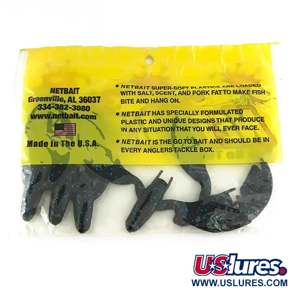 Siniset hileet erottuvat edukseen näiden amerikkalaisten pehmovieheiden syvänmustasta rungosta. Nämä 3" (7,5 cm) pituiset NetBait Paca Chunk Sr. -vieheet (tuotekoodi 6956) tarjoavat näyttävän profiilin käytettäväksi jigin trailerina. Tämä kappale on käyttämätön ja säilytetty alkuperäisessä keltasävyisessä pakkauksessaan. Merkki tunnetaan erityisestä koostumuksestaan, joka sisältää hajua, suolaa ja sianrasvaa – NetBaitin tavaramerkki. Leveillä, litteillä saksilla ja ontolla rungolla varustetut vieheet ovat saatavilla klassisessa Black Blue -värissä 5 kappaleen pusseissa.