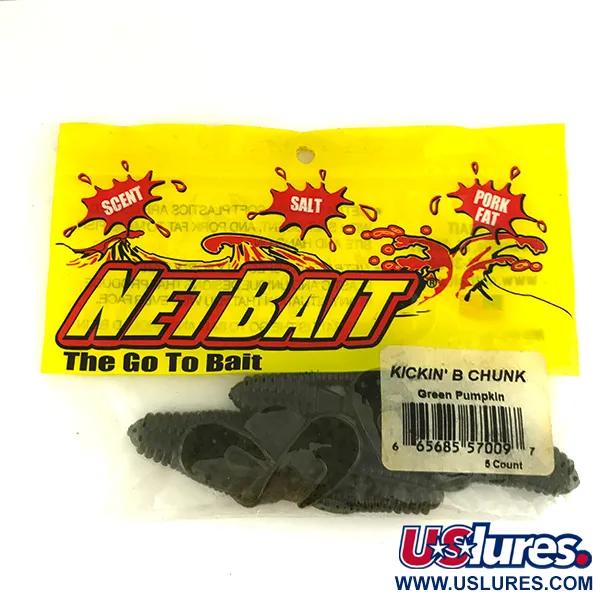Green Pumpkin -väri mustilla hileillä määrittelee nämä 7,5 cm:n jigit. Greenvillessä, Alabamassa valmistetut NetBait Kickin B Chunkit ovat jigitrailerien klassikkoja, ja niissä on voimakkaasti uritettu runko sekä kaksi sirppipyrstöä. Tämä tuotekoodilla 6836 merkitty pakkaus on käyttämätön, ja siinä on valmistajan alkuperäinen hajuste- ja suolakoostumus. Rakenteeseen kuuluu kaksi pientä sisäsaksea pääpyrstöjen välissä, ja ne on tarkoitettu flipping- ja pitching-tekniikoihin tiheän kasvuston seassa. Kuten keltaisessa pakkauksessa mainitaan, näissä vieheissä on käytetty suolan, hajusteen ja sianihran sekoitusta erityisen rakenteen saavuttamiseksi. Jokainen pakkaus sisältää puhtaita ja hyvin säilyneitä vieheitä.
