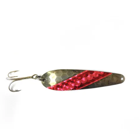 14 g (1/2 oz) massiivimessinkiä muodostaa tämän Northern King 28 -lusikan rungon, joka on uisteluviehe Len Thompsonin kanadalaisesta perinnöstä vuodelta 1984. Silmiinpistävä punainen holografinen vinoraita leikkaa teräksenvärisen pinnan ja täydentää vasaroitua hopeoitua yläosaa, joka heijastaa valoa jopa huonossa näkyvyydessä. Pituudeltaan 9,5 cm (3 3/4") oleva yksilö (tuotekoodi 0113) on säilyttänyt puhtaan ja kirkkaan ulkonäkönsä, kuntoluokitus 4/5. Aidon hopeoinnin käyttö oli valmistajan tekninen valinta varmistamaan, että lusikka pysyy näkyvissä suurissa syvyyksissä, joissa järvitaimenet ja lohet usein liikkuvat. Se on varustettu tavallisella kolmihaaraväkäkoukulla ja kestävällä uistinrenkaalla.