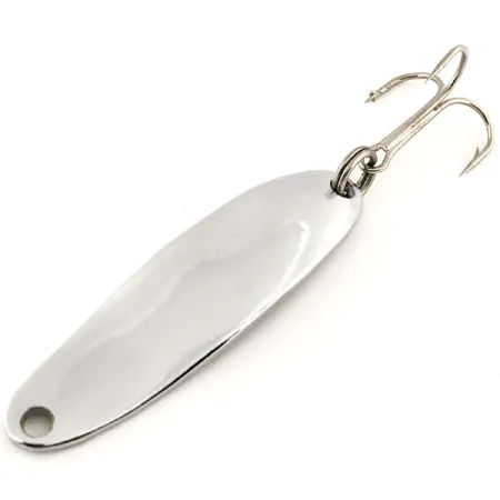 Tämä perinteinen pisaranmuotoinen 11 g (2/5 oz) lusikkauistin on varustettu kirkkaalla nikkeliviimeistelyllä, joka heijastaa valoa erittäin voimakkaasti. Koveralle puolelle on leimattu selkein tekstauskirjaimin ”ODAD”, mikä tunnistaa tämän yhdysvaltalaisen vieheen. Perässä on vankka kolmihaarakoukku kiinnitettynä kestävällä uistinrenkaalla, ja kärjessä on siististi porattu siimalenkin reikä. Arvosanalla 5/5 varustettu pinta on poikkeuksellisen hyvin säilynyt, eikä metallisessa kiillossa ole näkyviä naarmuja tai himmentymiä. Pituudeltaan 5,5 cm (2 1/4") oleva täysmetallinen runko on kokoonsa nähden huomattavan painava, mikä on tyypillistä Yhdysvalloissa valmistetuille vintage-lusikoille, jotka on suunniteltu pitkiin heittoihin tai syvään jiggaukseen. Tuotekoodi 13024 edustaa amerikkalaisen kalastusvälinehistorian kultakauden vakiomallia, jolloin yksinkertainen ja tehokas metallityö oli standardi.