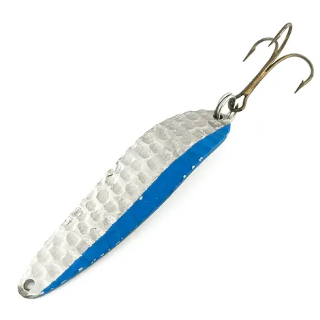 Voimakas sininen raita kulkee tämän 6,7 cm (2 3/4") nikkelilusikan ulkoreunalla, tarjoten jyrkän visuaalisen kontrastin hopeanväriseen runkoon. USA:ssa valmistettu Gator Ottogator on kunnoltaan 5/5, ja sen pinta on kirkas ja heijastava sekä vasaroidulla että tasaisella puolella. 12 g (2/5 oz) paino antaa riittävästi massaa vakaisiin heittoihin ja hallittuun syvyyteen kelauksen aikana. Etupuolen syvä vasaroitu tekstuuri vangitsee valoa kaikista kulmista, kun taas kääntöpuolella on puhdas, kiillotettu viimeistely Ottogator-leimalla. Tuotekoodilla 9267 tunnistettava viehe on varustettu kestävällä uistinrenkaalla ja terävällä kolmihaaralla, jossa on hyvin vähän ikääntymisen merkkejä.