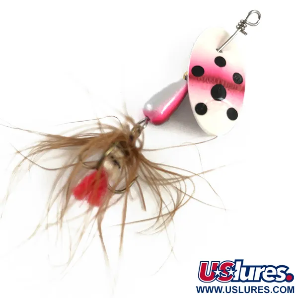 Mustat pilkut valko-vaaleanpunaisella liukuvärjätyllä lipalla tekevät tästä 3,5 cm (1 1/2") lipasta erinomaisen lisän ultrakevyen kalastuksen harrastajille. Tämä Panther Martin 1 -malli, tuotekoodi 4374, painaa 2 g (1/16 oz) ja edustaa merkin perinteistä italialaista käsityötaitoa. Pisaranmuotoinen runko on jaettu hopeiseen yläosaan ja vaaleanpunaiseen vatsaan, ja siinä on höyhenillä sidottu kolmihaarakoukku, jossa on ruskea häkilä ja punainen iskupiste. Kuntoluokituksen ollessa 6, viehe on käyttämätön ja samassa kunnossa kuin lähtiessään tehtaalta Italiasta. Lipan kiinnitys suoraan akselin läpi on valmistajan tunnusmerkki, jonka ansiosta lippa alkaa pyöriä välittömästi osuessaan veteen. Kultainen helmi erottaa painotetun rungon koukusta, varmistaen tasaisen pyörinnän ja tasapainon. Trout-värisarjan tunteville pilkulliset kuviot ja luonnonhöyhenet tarjoavat erittäin yksityiskohtaisen esityksen pienessä koossa.