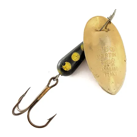 Tämän klassisen lipan tunnusmerkki on kullanvärinen lippa, jonka koveraan pintaan on leimattu numero 15 ja "ITALY". Tässä mallissa (tuotekoodi 11965) on pisaranmuotoinen lyijyrunko, joka on viimeistelty syvänmustaksi kolmella keltaisella pisteellä. Rakenteessa käytetään suoraan runkolankaan kiinnitettyä lippaa, jossa lanka kulkee suoraan metallin läpi; tämä ratkaisu takaa välittömän pyörimisen. 15 g (1/2 oz) paino ja 6 cm (2 1/4") pituus antavat riittävästi massaa syvän veden heittoihin tai virran keskellä olevien kohteiden tavoittamiseen. Varustukseen kuuluu tukeva pronssinen kolmihaarakoukku, jossa on vain vähän kulumaa. Tämä yksilö on erinomaisessa kunnossa (arvosana 5/5), kultaus kiiltää kirkkaasti ja painotetun rungon maalipinta on selkeä. Tarkempi tarkastelu paljastaa pantterilogon ja patenttinumeron 1009460, jotka on syövytetty selkeästi lipan pintaan.
