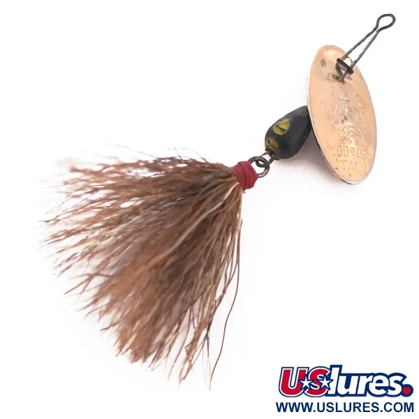 Tämän vintage-kuntoisen Panther Martin 2 -lippauistimen koveraan kultaiseen lippaan on leimattu "Italy", mikä edustaa klassista eurooppalaista osaamista yhden historian menestyneimmän taimenlipan takana. Painoltaan 2,4 g (3/32 oz) oleva uistin hyödyntää ainutlaatuista, suoraan runkolankaan kiinnitettyä lippaa, joka alkaa pyöriä välittömästi veteen osuttuaan. 5 cm (2") runko on viimeistelty pisaranmuotoisella, mustalla ja keltapilkullisella rungolla, johon on yhdistetty tuuhea ruskea bucktail-karvatupsu näkyvällä punaisella sidoksella. Tämä yksilö, tuotekoodiltaan 4016, on 5/5-kunnossa, eikä kultauksessa tai karvapyrstössä ole merkkejä kulumisesta. Toisin kuin tavalliset lipat, tämän mallin lippa luo laajan liikkeen ja voimakkaan värinän, joka auttaa kaloja löytämään vieheen. Yläosan kestävä lankasilmukka on suora ja valmis lukolle tai suoralle solmulle.