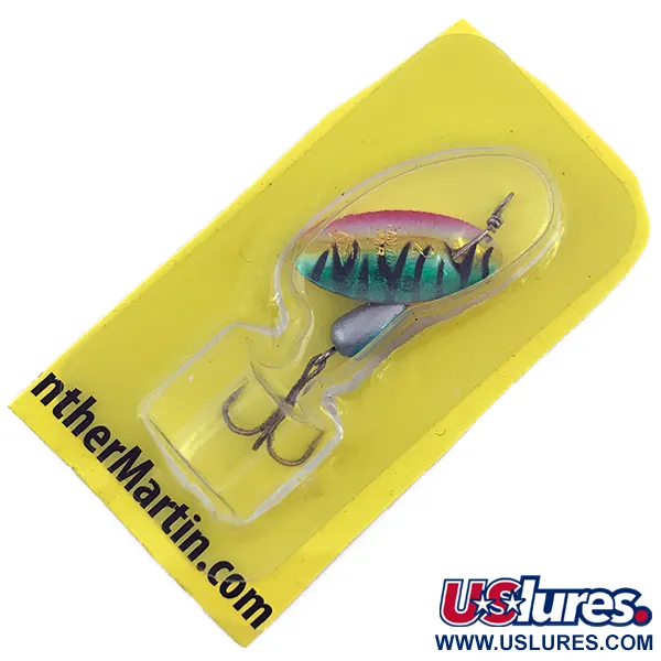 Eloisat vaaleanpunaisen, keltaisen ja vihreän sävyt määrittelevät tämän klassisen lipan Fire Tiger -kuvion, jota täydentävät tummat pystyraidat ja heijastava viimeistely. Painoltaan 2,5 g (3/32 oz) ja kokonaispituudeltaan 5 cm (2") oleva Panther Martin 2 on varustettu merkin tunnusomaisella pisaranmuotoisella rungolla ja ainutlaatuisella akseliin kiinnitetyllä lehdellä. Toisin kuin monet muut lippauistimet, lehti on asennettu suoraan akselin läpi. Tämä rakenne mahdollistaa lehden vapaan pyörimisen ja pitää sen lähempänä runkoa kelauksen aikana. Tämä nimenomainen malli, tuotekoodilla 4993, on Harrison-Hoge Industriesin valmistama ja se on yhä alkuperäisessä keltaisessa pahvipakkauksessaan. Runko on viimeistelty tasaisella metallisella sinihopeisella sävyllä, ja siinä on terävä kolmihaarainen koukku. Uistin on käyttämätön ja säilynyt alkuperäisessä blister-pakkauksessaan, jonka keltaisessa taustakortissa on Port Jeffersonin, New Yorkin pääkonttorin yhteystiedot.