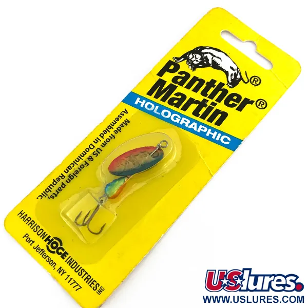 Tämän Panther Martin -lipan lehdessä on eloisa holografinen viimeistely, joka heijastaa punaisen, sinisen ja kullan sävyjä, pakattuna alkuperäiseen Harrison Hoge Industries -pakkaukseen. Tuotekoodilla 8334 merkitty 1 3/4" (4,5 cm) viehe on täydellinen esimerkki in-line-lipasta, jonka lehti pyörii suoraan keskiakselin ympäri. Tämä yksilö painaa 3/32 oz (2,5 g), ja siinä on painotettu keltainen pisaranmuotoinen runko ja terävä kolmihaarakoukku. Koottu Dominikaanisessa tasavallassa yhdysvaltalaisista ja ulkomaisista osista, ja pakkaus korostaa sen Port Jefferson, NY, alkuperää. Viehe on käyttämätön ja siinä on alkuperäinen tehtaan hohde, mikä oikeuttaa kuntoluokitukseen 6. Tässä holografisessa sarjassa käytetään valoa taittavia pintoja, jotka on suunniteltu jäljittelemään pikkukalan suomuja eri veden kirkkausasteilla.