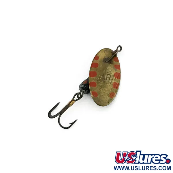 Messinkilavan kuperaan pintaan on selvästi leimattu merkinnät "MARTIN" ja "ITALY", jotka osoittavat tämän yksilön alkuperän. Tässä perinteisessä Panther Martin 2 -lipassa, tuotekoodiltaan 9530, on merkille ominainen lapa, joka on asennettu suoraan akselin läpi. Lavassa on punaisia pystysuoria viivoja reunoilla, mikä luo jyrkän kontrastin mustalle pisaranmuotoiselle rungolle, jossa on pieniä punaisia ja oransseja täpliä. Paino on 2,5 g (3/32 oz) ja pituus 3,5 cm (1 1/2"), mikä on klassinen koko puuroforellin kalastukseen. Kunto on luokiteltu 4/5, ja messinki- sekä maalipinnoilla näkyy kevyttä ja rehellistä kulumista, joka kertoo sen historiasta. Alkuperäiseen varustukseen kuuluu yksi kolmihaarakoukku, joka on kiinnitetty painotetun rungon takaosaan. Teräsakseli on suora ja kokonaisuus on edelleen jämäkkä, mikä on tyypillistä 1900-luvun puolivälin italialaiselle valmistuslaadulle näissä varhaisissa lipoissa.