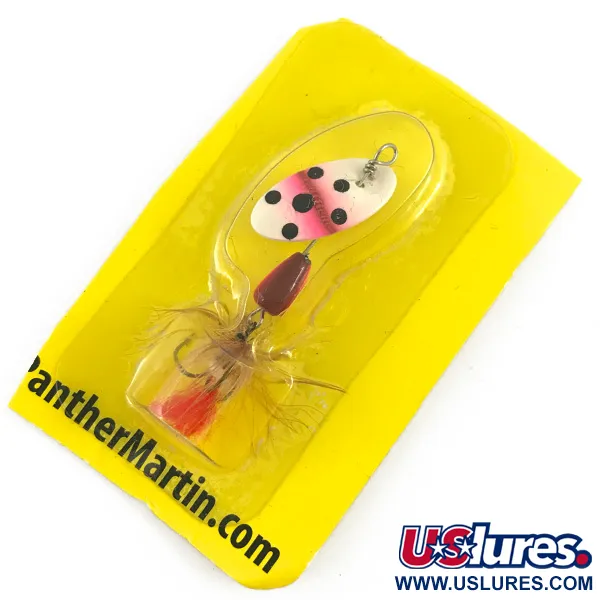 Eloisa vaaleanpunaisen ja valkoisen liukuväri peittää tämän mallin kuperan lipan, jota korostavat Panther Martinin klassiselle estetiikalle tyypilliset mustat pilkut. Tässä 3/32 oz (2,5 g) lipassa on merkille tunnusomainen suoraan akselille asennettu lippa, joka on ollut brändin tavaramerkki esittelystään lähtien. Tuotekoodilla 4603 listattu viehe on 2" (5 cm) pitkä ja kuuluu UV-sarjaan, jossa käytetään fluoresoivia viimeistelyjä näkyvyyden parantamiseksi. Runko on syvän viininpunainen, ja siinä on sidottu kolmihaarakoukku, joka on koristeltu luonnonvärisellä höyhenellä ja kirkkaan punaisella ärsykkeellä. Jakelijana toimii Harrison-Hoge Industries Port Jeffersonista, NY; viehe on käyttämätön ja alkuperäisessä keltaisessa läpipainopakkauksessaan. Keltaisessa taustakortissa on varoitukset erittäin terävistä koukuista sekä PantherMartin.com-verkko-osoite reunassa.