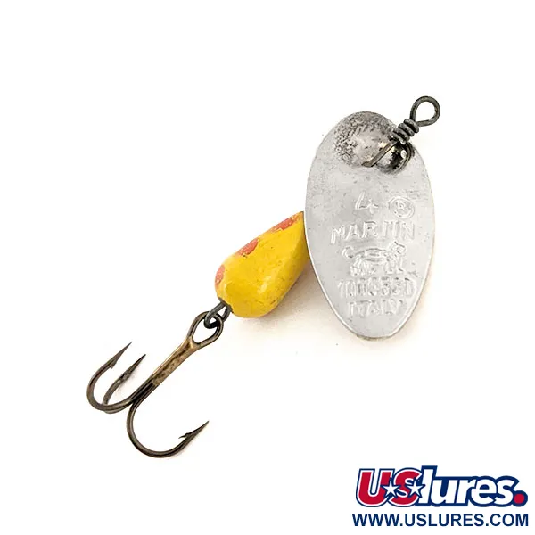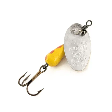 Tämän Panther Martin 4:n hopeiseen lippaan on selvästi leimattu merkintä sen italialaisesta alkuperästä, mitä varhaisten eurooppalaisten kalastusvälineiden keräilijät arvostavat suuresti. Pisaranmuotoisessa rungossa, joka painaa 4 g (1/8 oz), on klassinen keltainen väritys selkeillä punaisilla pisteillä. Viehe on 4 cm (1 1/2") pitkä, ja se on varustettu kestävällä kolmihaarakoukulla ja ikonisella runkoon kiinnitetyllä lipalla, joka kulkee suoraan lanka-akselin läpi. Tämä erityinen valmistustapa, jossa lippa pyörii suoraan langassa ilman erillistä lenkkiä, on merkin puolivälin vuosisadan muotoilun tunnusmerkki. Arvosanalla 5/5 varustettu yksilö on erinomaisessa kunnossa; maali on säilyttänyt alkuperäisen kirkkautensa eikä metallipinnoilla ole merkittävää tummumista. Lipan pintaan on pakotettu hyppäävä panteri -logo ja "REG. U.S. PAT. OFF." -merkintä. Siiman kiinnityslenkin lankapunos on tiukka ja suora, mikä kertoo alkuperäisestä tehdasasennuksesta.