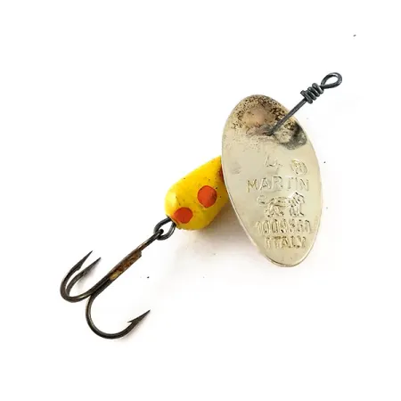 Hopeisen lipan koveralle puolelle on selvästi meistetty "Italy", mikä osoittaa tämän Panther Martin 4:n olevan alkuperäisen eurooppalaisen tuotantolinjan yksilö. Viehe painaa 4g (1/8 oz) ja sen kokonaispituus on 4cm (1 1/2"). Siinä on keltainen pisararunko, jota korostavat selkeät punaiset pisteet. Lipassa, numeroltaan 1009368, on ikoninen L MARTIN -nimi ja leijonaleima, jotka ovat keskeisiä yksityiskohtia aidon italialaisen vintage-tuotannon varmentamiseksi. Kuntoarviona on 5/5, viimeistely on kirkas ja metalliosissa ei ole käytetyille lipoille tyypillistä kulumista. Tämä nimenomainen malli, tuotekoodiltaan 13282, hyödyntää klassista in-line-rakennetta, jossa hopeinen lehti on suoraan akselilla. Kokonaisuuden täydentää lankasidoksella varmistettu kolmihaarakoukku, jonka sidokset ovat merkille tyypillisen tiukat ja tasaiset.