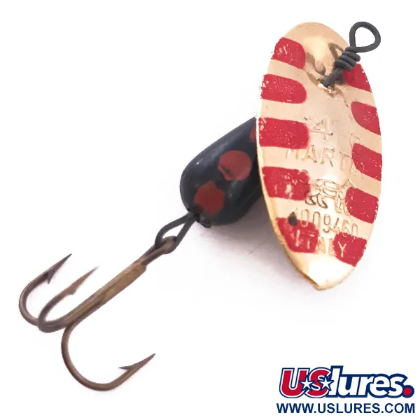 Kultaus ja kirkkaanpunaiset vinoraidat määrittelevät tämän yksilön klassisen lipan. Suoraan metalliin stanssatut merkinnät "4 MARTIN" ja "ITALY" sekä numero "009460" vahvistavat sen välimerelliset valmistusjuuret. Tässä 4 g (1/8 oz) lipassa, joka on luetteloitu tuotekoodilla 4022, on Panther Martinille ominainen runkolanka-asennus, jossa lanka kulkee suoraan lipan läpi perinteisen leikarin sijaan. Kokonaispituudeltaan 4,5 cm (1 3/4") oleva rakenne keskittyy painotetun mustan pisararungon ympärille, joka on koristeltu silmiinpistävillä punaisilla pisteillä. Koukutuksena on pronssiviimeistelty kolmihaarakoukku ja pieni messinkihelmi välilevynä lipan asemointia varten. 5/5-kunnossa oleva viehe on upea; punaiset raidat ja rungon pisteet ovat säilyttäneet värinsä erinomaisesti, ja kullatut pinnat kiiltävät kirkkaasti.