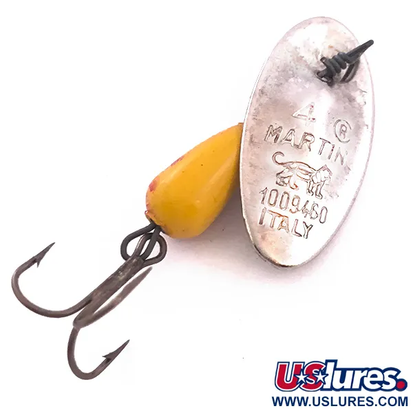 Painotettu keltainen pisararunko pienillä punaisilla pisteillä muodostaa tämän klassisen Panther Martin 4 -lipan ytimen, tuotekoodi 4027. Hopeisessa lipassa, jonka kokonaispituus on 4,5 cm (1 3/4"), on ikoniset merkinnät, kuten "MARTIN", kissalogo ja alkuperämerkintä "ITALY" sekä numero "1009480". Toisin kuin tyypillisissä in-line-lipassa, tässä mallissa käytetään suoraan akselin varressa pyörivää lehteä, mikä on tämän italialaisvalmisteisen vieheen tunnusomainen piirre. Vieheen paino on 4 g (1/8 oz), mikä tekee siitä erinomaisen valinnan kevyillä välineillä tapahtuvaan taimenen kalastukseen pienissä puroissa. Pronssiviimeistelty kolmihaarakoukku on terävä ja rakenteellisesti kestävä, osoittaen korkeaa laatua. Pieni messinkinen välihelmi keltaisen rungon ja hopeisen lehden välissä varmistaa puhtaan mekaanisen toiminnan.