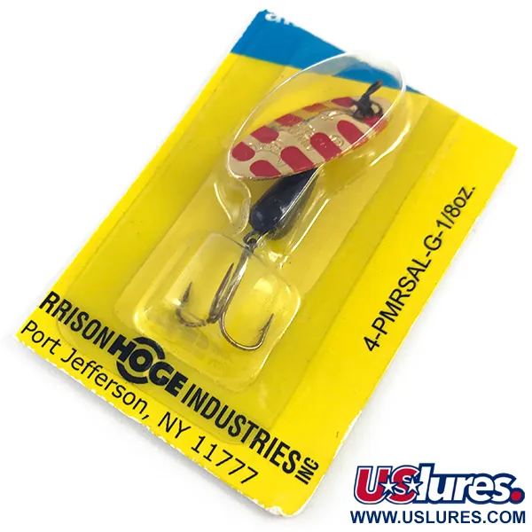Tämä klassinen 4 gramman lippa käyttää kultaista lippalehteä, joka on koristeltu punaisilla pisteillä. Vieheessä on tunnusomainen runkoon tukeutuva lipparakenne, jossa lehti pyörii suoraan akselin ympäri. Tuotekoodilla 4372 varustettu yksilö on alkuperäisessä Harrison Hoge Industries -läpipainopakkauksessaan, jossa on Port Jeffersonin (NY) osoite. Koska viehe on käyttämätön, pisaranmuotoisen rungon tumma pinta ja kolmihaarakoukku ovat säilyneet erinomaisessa kunnossa. Pakkauksessa on perinteinen keltainen ja sininen ulkoasu, ja sen kääntöpuolella on vintage-tarjous sekä mustavalkoinen kalastuskuva. Tämä malli 4-PMRSAL-G on 4,5 cm pitkä, ja se teki Panther Martinista perusvieheen taimenen ja ahvenen kalastajille. Pakkaus mainitsee myös valmistajan verkkosivuston ja Columbia St. -osoitteen, mikä kertoo tietystä aikakaudesta brändin historiassa.