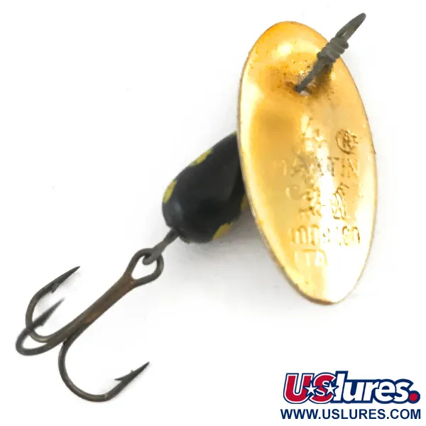"Italy" on selvästi leimattu kultaisen lipan alapuolelle, mikä tekee tästä Panther Martin 4 -lipasta aidon vintage-löydön kevytkalastuksen harrastajalle. Paino on 4g (1/8oz) ja kokonaispituus 4cm (1 1/2"). Tässä lipassa on ikoninen pisaranmuotoinen runko, jossa on korkeakontrastinen musta viimeistely keltaisilla pisteillä. Tuotekoodilla 4537 tunnistettava muotoilu sisältää merkin tunnusomaisen akselikiinnityksen, jossa lippa pyörii suoraan akselin ympäri ilman erillistä lenkkiä. Kultasävyiseen metallilippaan on syvään stanssattu tuotemerkki "MARTIN" ja alkuperämaa. Sekä painotettu runko että metallilippa ovat säilyttäneet alkuperäisen kiiltonsa, ja yksilö on erinomaisessa kunnossa (arvosana 5/5). Kokonaisuuden täydentää terävä kolmihaarakoukku, joka on kiinnitetty alkuperäisellä lankasilmukalla.