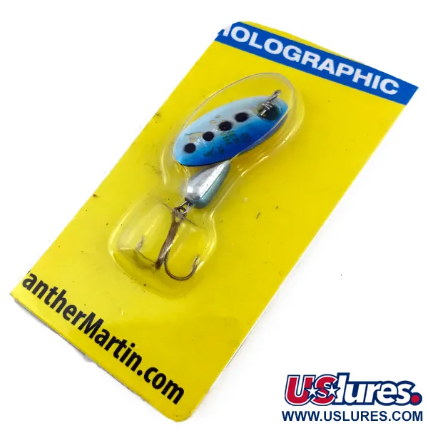 Tämä Panther Martin 4 -lippa painaa 1/8 oz (4 g) ja on erinomainen esimerkki merkin Holographic-sarjasta Blue Trout -värityksellä. Holografisessa lehdessä on neljä selkeää tummaa täplää liukuvärjätyllä sinisellä pohjalla, ja se on suunniteltu heijastamaan valoa kaikista kulmista. Vieheen pituus on 1 3/4" (4,5 cm), ja siinä käytetään tunnusomaista runkoon kiinnitettyä lehteä, joka pyörii suoraan akselin ympäri ilman sankaa. Tämä tuotekoodilla 5007 varustettu yksilö on käyttämätön ja alkuperäisessä keltaisessa pakkauksessaan. Hopeinen, pisaranmuotoinen runko on painotettu helpottamaan heittopituutta pienemmissä puroissa. Pakkauksen takapuolella olevat valmistustiedot osoittavat Harrison Hoge Industriesiin Port Jeffersonissa, New Yorkissa, ja tuote on valmistettu Dominikaanisessa tasavallassa. Terävä kolmihaarakoukku on kiinnitetty painotetun rungon taakse.