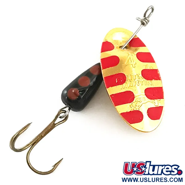 Kultainen lehti punaisilla raidoilla määrittää tämän koon 4 lipan, joka painaa tasapainoiset 4g (1/8oz). Lehden koveraan puoleen on meistetty Panther Martin -nimi ja numero 4, mikä korostaa sen italialaista alkuperää. Tässä mallissa on tunnusomainen in-line-rakenne, jossa runkolanka kulkee suoraan lehden läpi mahdollistaen herkän pyörinnän. Pienen kultaisen helmen takana on musta pisararunko, joka on koristeltu korkeakontrastisilla punaisilla täplillä. Kokonaispituudeltaan 4 cm (1 1/2") uistin on varustettu tukevalla pronssatulla kolmihaarakoukulla. Kunto on 5/5, eli uistin on käyttämätön ja sen maalipinta on kirkas ja täydellisesti säilynyt. Tuotekoodi 6335 liittyy tähän väriyhdistelmään, joka on suunniteltu erottuvaan esittelyyn eri vesiolosuhteissa.