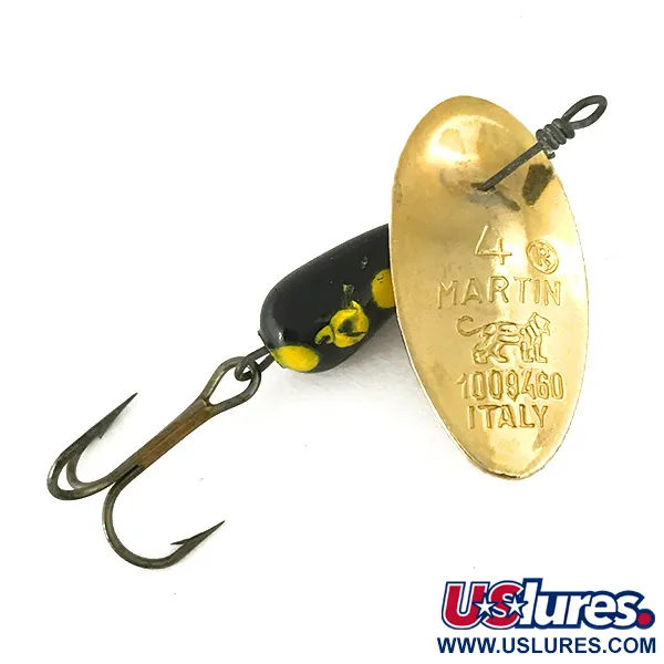 Painoltaan 4g (1/8oz) ja kokonaispituudeltaan 4cm (1 1/2"), tämä yksilö edustaa varhaisen italialaisen tuotannon tarkkaa käsityötä. Kuperaan kultapintaiseen lehteen on syvästanssattu kokonumero 4, Panther Martin -tuotenimi, klassinen leijonalogo, patenttinumero 1009460 ja alkuperämaa Italia. Tunnusomainen pisararunko on viimeistelty voimakaskontrastisella mustalla maalilla ja keltaisilla pilkuilla – kuvio, johon kalastajat ovat perinteisesti luottaneet niin kirkkaissa kuin sameissakin vesissä. Koska lehti on asennettu suoraan lanka-akselille ilman ripustinta (clevis), rakenne luo virtaviivaisen profiilin, joka alkaa pyöriä heti veteen osuessaan. Tämä viehe, tuotekoodi 7393, on erinomaisessa 5/5-kunnossa; lyijyrungon maali ja lehden metallipinnoite ovat poikkeuksellisen kirkkaita. Vieheen päädyssä on terävä, pronssattu kolmihaarakoukku, joka on kiinnitetty vahvaan lankasilmukkaan.
