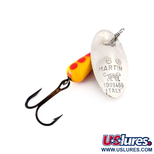 Nikkelilehteen on selvästi leimattu "ITALY", mikä on näiden varhaisten eurooppalaisten lippojen tunnusmerkki. Tässä Panther Martin 6 -mallissa on 3/16 unssin (6 g) paino ja ikoninen rungon läpi kulkeva lehti, joka erottaa sen perinteisistä sangallisista lipoista. Lehteen on stanssattu vintage-leijonalogo sekä patenttinumero 1009460, mikä kertoo sen historiallisista juurista. Kokonaispituudeltaan 5,5 cm (2 1/4") uistin on rakennettu kirkkaankeltaisen pisararungon ympärille, jota koristavat selkeät punaiset täplät. Lehden nikkeliviimeistely on säilynyt kirkkaana, ja takaosassa on siisti kolmihaarakoukku alkuperäisellä tummalla pinnoitteellaan. Kuntoarvio on 5/5, runkolanka on suora ja rungon maalipinta on erittäin tarkka. Koska lehti on kiinnitetty suoraan lankaan, se tarjoaa ainutlaatuisen uintiliikkeen, joka on tehnyt tästä mallista taimenkalastajien suosikin vuosikymmeniksi. Tämä tuotekoodilla 10141 listattu yksilö edustaa merkin italialaisen valmistusaikakauden tarkkaa käsityötä.