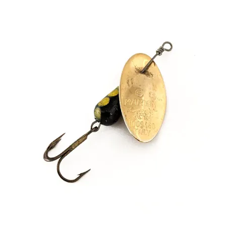 Kuperaan kultaiseen lehteen on selkeästi meistetty vintage-aikainen Panther Martin -logo sekä Italian alkuperämerkintä, mikä erottaa tämän varhaisen tuotantomallin. Tässä yksilössä, tuotekoodiltaan 11117, on klassinen musta pisararunko, joka on koristeltu kirkkailla keltaisilla pisteillä korkean vedenalaisen kontrastin saavuttamiseksi. Vieheen pituus on 5,5 cm (2 1/4") ja paino 6 g (3/16 oz). Se hyödyntää in-line-rakennetta, jossa lehti on kiinnitetty suoraan runkolankaan. Tämä merkille ominainen suunnitteluratkaisu luo ainutlaatuisen uintilistan verrattuna perinteisiin sankakiinnitteisiin lippoihin. Varustukseen kuuluu pronssattu kolmihaarakoukku ja tiukasti kierretty lankasilmukka, jotka molemmat ovat säilyneet poikkeuksellisen hyvin. Kuntoarviolla 5/5, lehden kultapinta ja painotetun rungon maalipinta ovat pysyneet erittäin kirkkaina ja kulumattomina.