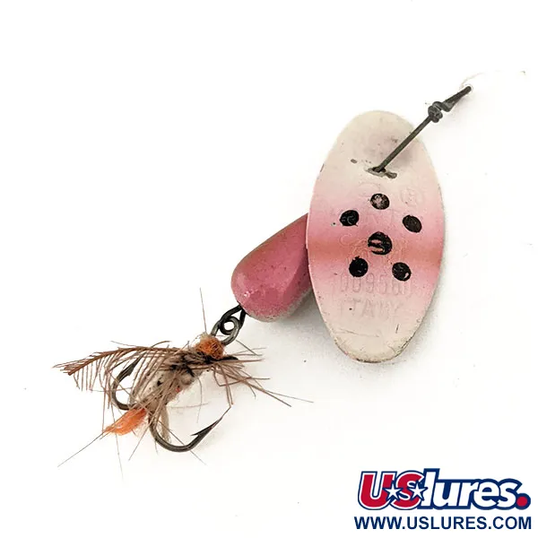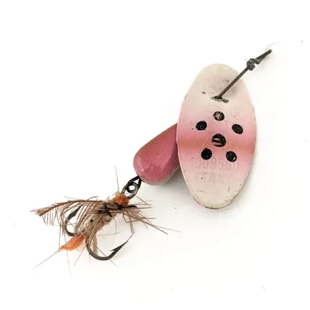 Viisi selkeää mustaa pistettä erottuu lipan valko-vaaleanpunaisesta väriasteikosta, mikä on tälle italialaiselle klassikolle ominainen ulkoasu. Tämä 6 g (3/16 oz) painava Panther Martin 6 on pituudeltaan 5 cm (2 in) ja sen tuotekoodi on 12601. Pisaranmuotoinen runko on maalattu yhteensopivalla vaaleanpunaisella sävyllä, ja perässä on sidottu kolmihaarakoukku, jossa on hienovaraisia ruskeita ja oransseja kuituja. Koska lippa on kiinnitetty suoraan akseliin, sen profiili pysyy erittäin kompaktina verrattuna perinteisiin sankaripohjaisiin lippoihin. Tämä yksilö on 5/5-kunnossa, ja lipan kääntöpuolella oleva ITALY-leima on edelleen terävä ja selkeästi luettavissa. Lipan yläosan pehmeä vaaleanpunainen häivytys luo hienon kontrastin valkoista pohjaa vasten. Runko on jämäkkä ja kaikki osat ovat vailla merkittäviä kulumisen jälkiä, säilyttäen alkuperäisen tehdasloistonsa.