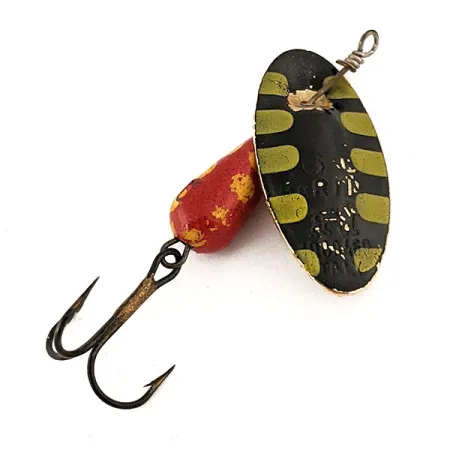 Lipan koveraan pintaan suoraan stansattu "ITALY"-merkintä tunnistaa tämän Panther Martin 6:n vintage-yksilöksi sen alkuperäisiltä eurooppalaisilta valmistusjuuriltaan. Tässä nimenomaisessa mallissa, joka on luetteloitu tuotekoodilla 12604, on ikoninen pisaranmuotoinen runko perinteisellä punaisella värityksellä ja keltaisilla pilkuilla. Paino on 3/16 oz (6 g), mikä antaa painotetulle rungolle tarvittavan massan pitkiin heittoihin pienissä puroissa tai joissa. Musta lippa on koristeltu erottuvilla keltakultaisilla poikkiraidoilla, jotka on suunniteltu luomaan visuaalista kontrastia. Kokonaispituudeltaan 5 cm (2") tämä lippa hyödyntää kuuluisaa "akseli läpi lipan" -rakennetta, jossa lanka kulkee suoraan lipan läpi ilman erillistä sankaa. Tämä rakenne mahdollistaa välittömän pyörimisen heti, kun uistin osuu veteen. Varusteet ovat edelleen toimintakuntoisia, mukaan lukien takasilmukkaan kiinnitetty alkuperäinen pronssattu kolmihaarakoukku. Vieheessä on rehellistä kulumista vieherasiassa vietetystä ajasta, ja sen kuntoarvio on vankka 4/5. Pienet maalipinnan puutteet rungossa ja lipassa vain lisäävät sen aitoa vintage-viehätystä. Se on edelleen loistava esimerkki italialaisesta innovaatiosta, joka määritti inline-lippojen kategorian.