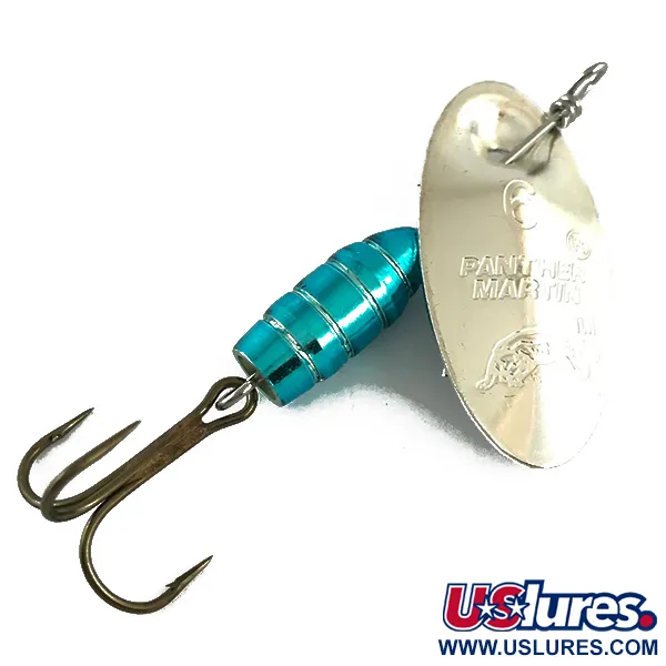 Turkoosimetalliset segmentit muodostavat tämän vintage-lipan painotetun rungon, tarjoten eloisan väripilkun kiillotettua hopeista lehteä vasten. Itse lehti on asennettu ainutlaatuisesti suoraan rungon läpi, mikä on Panther Martinin uranuurtava muotoiluratkaisu tasaisen pyörinnän varmistamiseksi. Tuotekoodilla 4409 tunnistettava 3/16 oz (6 g) malli edustaa klassista italialaista käsityötaitoa leimatuilla "PANTHER MARTIN" -teksteillään ja tunnistettavalla loikkaavan kissan logollaan. Kaksi pientä kullanväristä helmeä toimivat välikkeinä lehden ja syaaninvärisen rungon välillä, jonka kokonaispituus on 2" (5 cm). Tämä uistin on käyttämätön, säilyttäen alkuperäisen tehdasviimeistelynsä ja kiiltonsa (kuntoluokitus 6). Terävä kolmihaarakoukku on kiinnitetty runkolankaan, valmiina veteen tai keräilijän vitriiniin.